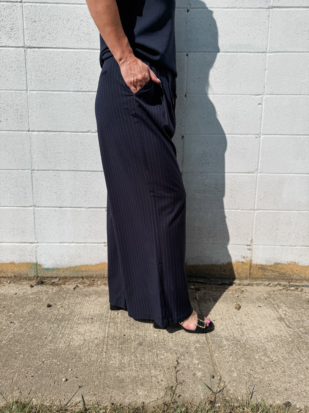 Elevate your wardrobe with these chic Navy Pinstripe Trousers, designed to flatter your silhouette while providing all-day comfort. Their timeless pinstripe pattern adds a sophisticated edge, making them perfect for both everyday wear and dressed-up occasions like work or a night out. Experience the perfect blend of style and ease that effortlessly transitions from office meetings to evening events.