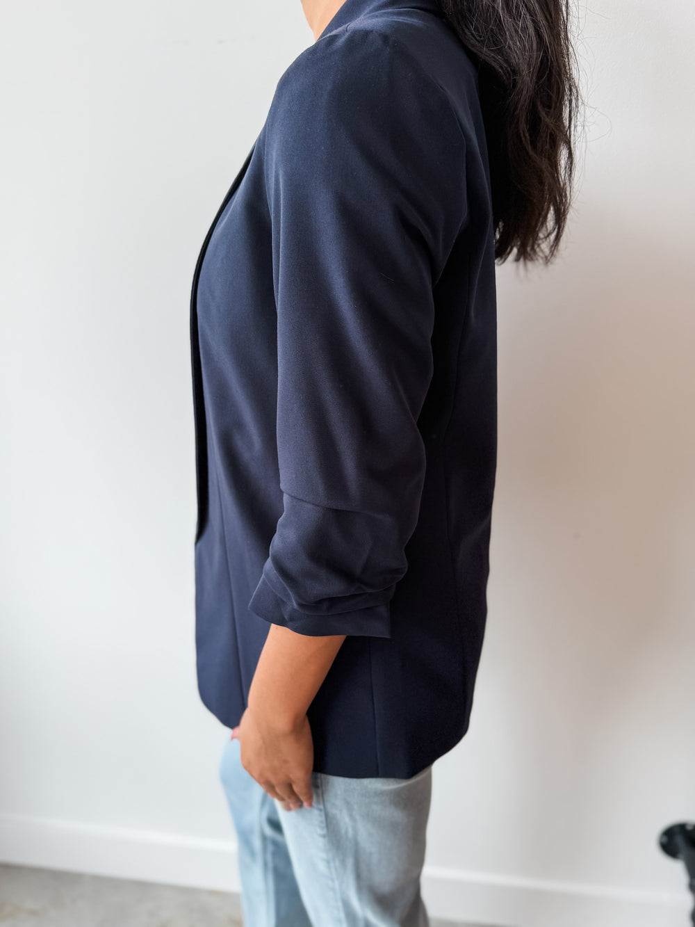 The Bosella Open Blazer showcases ruched detailing on the sleeves, offering a flattering 3/4 length that balances comfort and style. Its stunning navy blue color and sophisticated open front design make it an elevated choice for any wardrobe. Experience a perfect fit and timeless appeal with this versatile blazer.