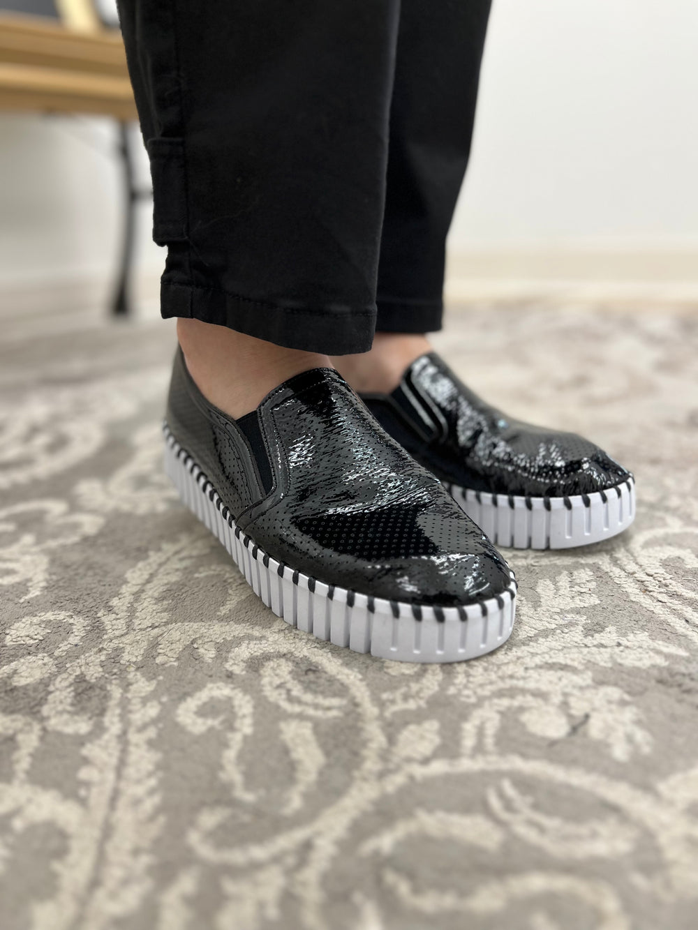 Experience the comfort and style of our Tulip Slip On Shoes. With patented shine and threaded stitch work detailing on the sole, these shoes come in both striking black and sharp nude. Perfect for all-day wear and easily styled up or down, these will become your go-to shoes. Super comfortable, have been fitting on the smaller side so we recommend trying them on in store. Don't miss out!