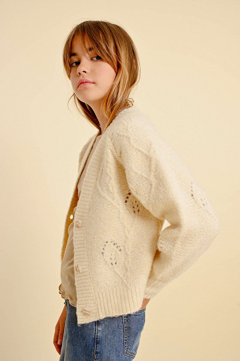 Indulge in ultimate comfort with our Girls Pointelle Knit Cardigan. Made with super soft material, this cardigan will keep your little one cozy and stylish. The cute fit adds a touch of charm to any outfit. Elevate her wardrobe with this must-have piece!