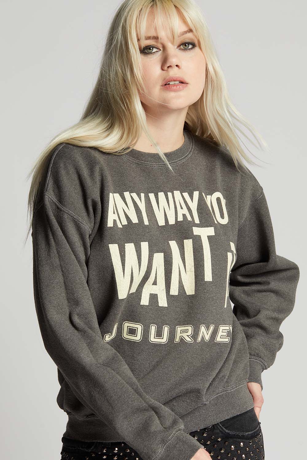 Elevate your outfit in our Journey Any Way You Want It Sweatshirt! This classic sweatshirt pays homage to Journey's legendary hit, featuring the band and song title on the front while blending classic rock vibes with cozy comfort. Made with our super soft vintage washed fabric, ribbed hems, and a crew neckline.