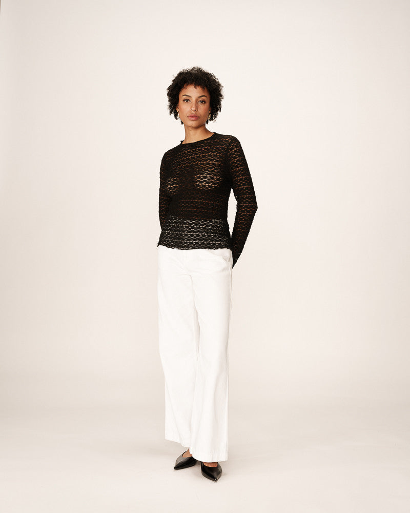 Experience feminine confidence and ease in the PRAIRIE Lace Top. Made from transparent lace, this long-sleeved top features elegant wavy finishes at the neckline and cuffs for added sophistication. With a high neckline and long sleeves, the PRAIRIE top exudes a refined charm.