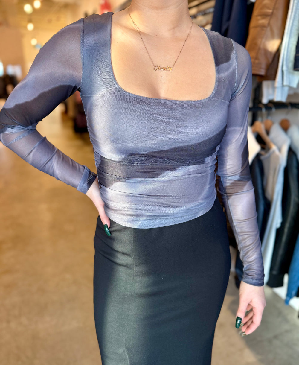 Elevate your wardrobe with the Rosa Mesh LS Top! Made with a gorgeous grey wave pattern, this top is both elegant and comfortable, thanks to the breathable mesh material. The square neckline and flattering fit, with rouching on the sides, make it perfect for both dressy occasions and everyday wear. Experience beauty and comfort all in one!