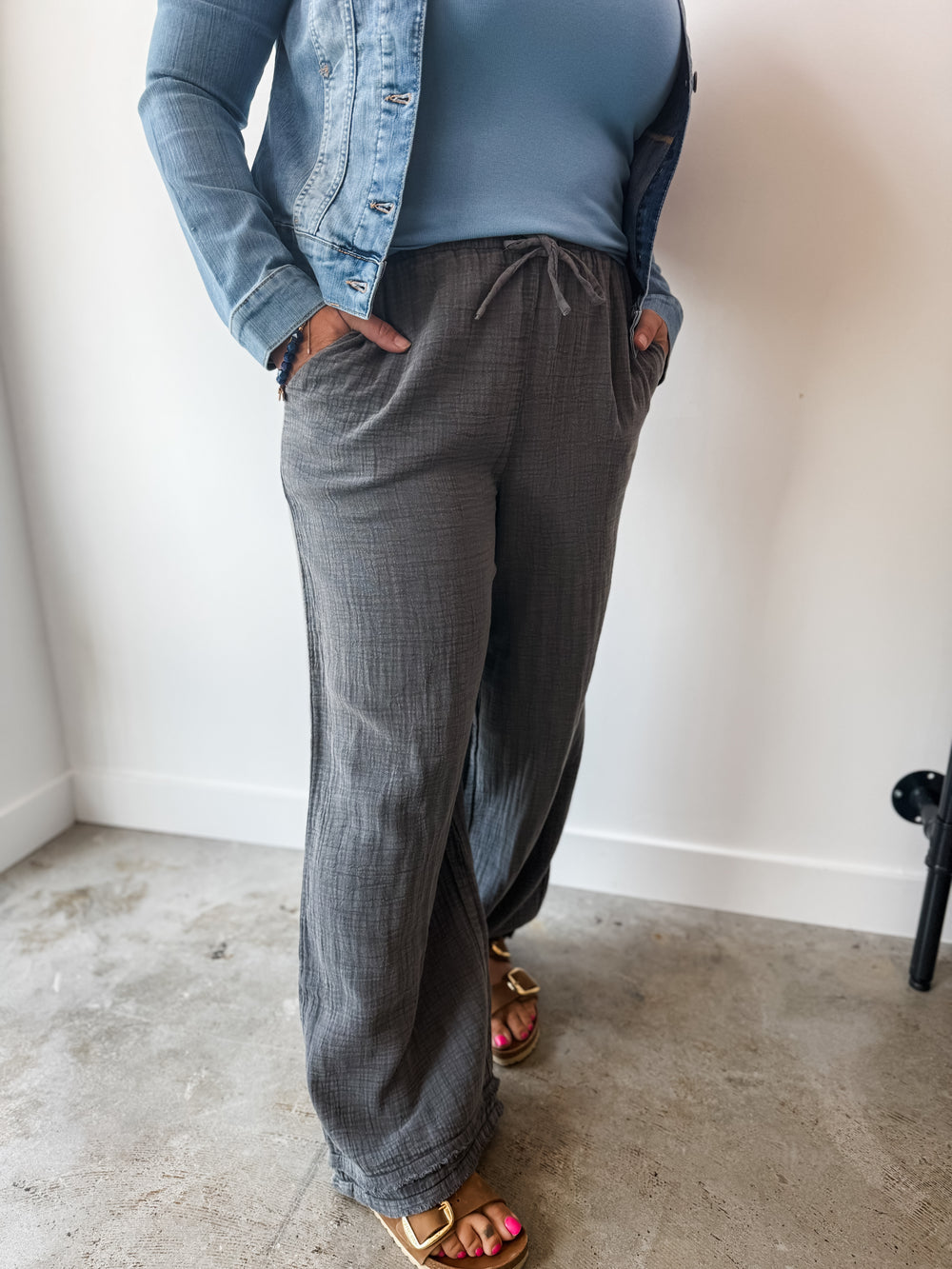 Experience effortless style with the Merry Pants in a stunning coal grey shade. These lightweight, comfortable pants offer a flattering fit that moves with you, making every step feel easy and breezy. Perfect for everyday wear, they combine fashion and comfort seamlessly to elevate your wardrobe.