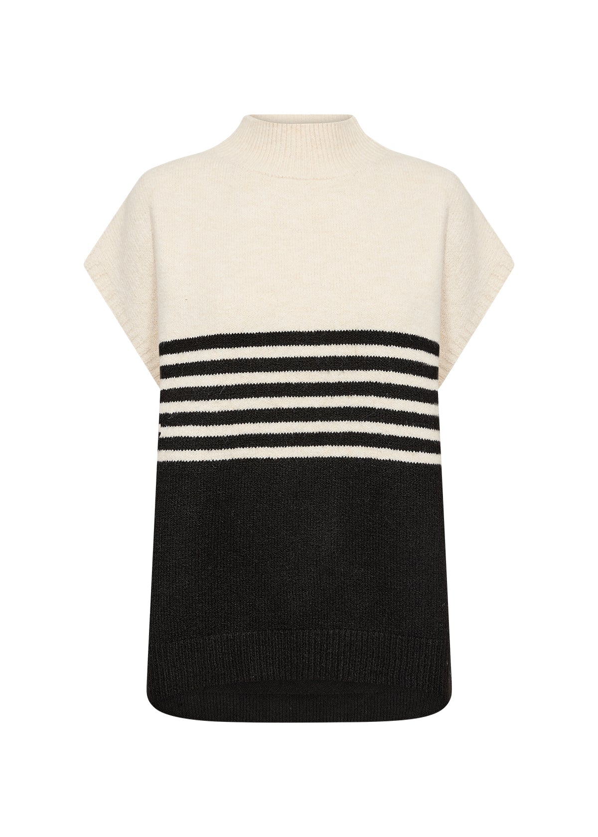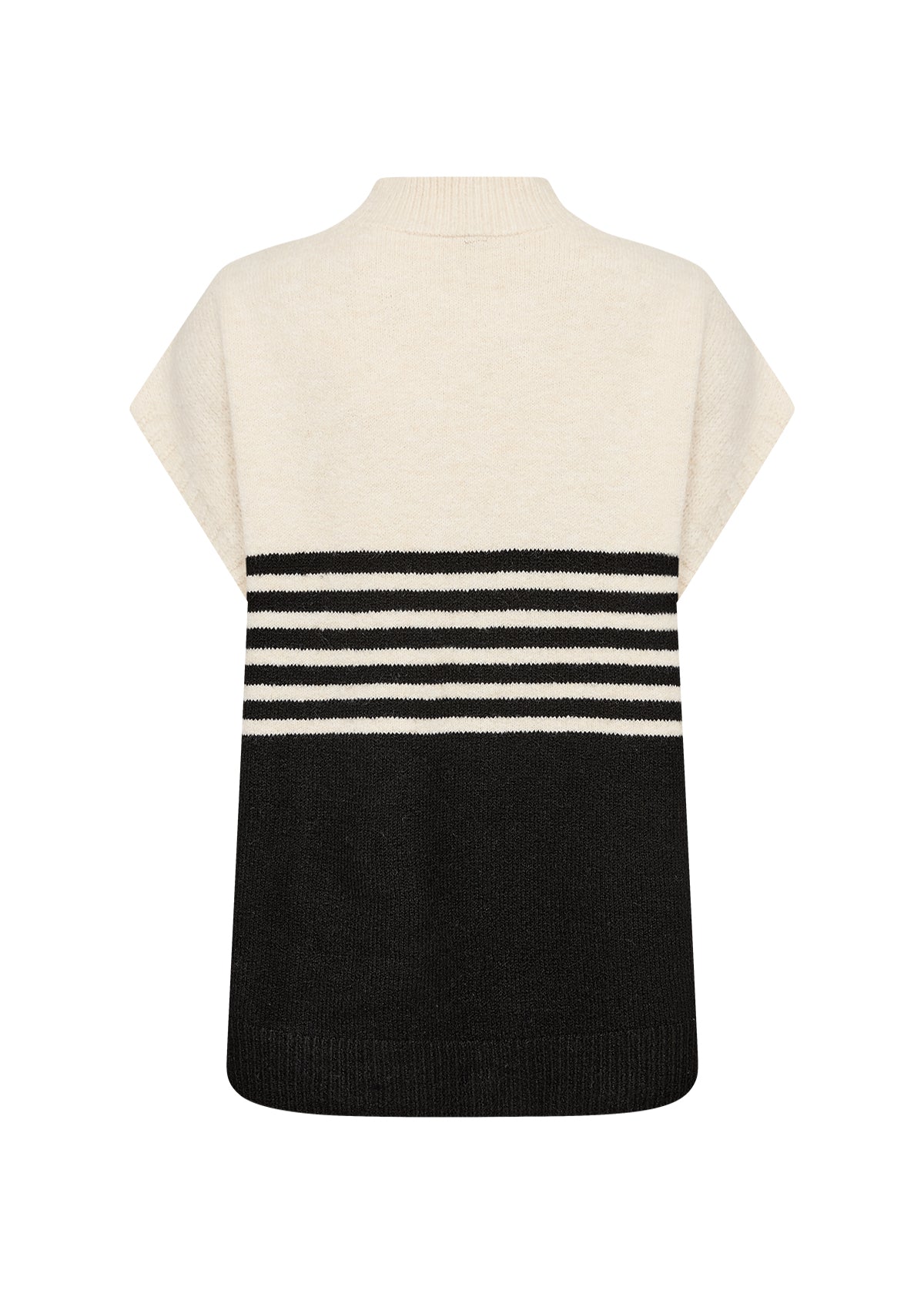 SELVI 1 is a stylish waistcoat made from 97% recycled polyester and 3% elastane. It features a ribbed collar, wide arm openings, and a striped pattern across the midsection. Perfect for layering over a fitted shirt or under a jacket.
