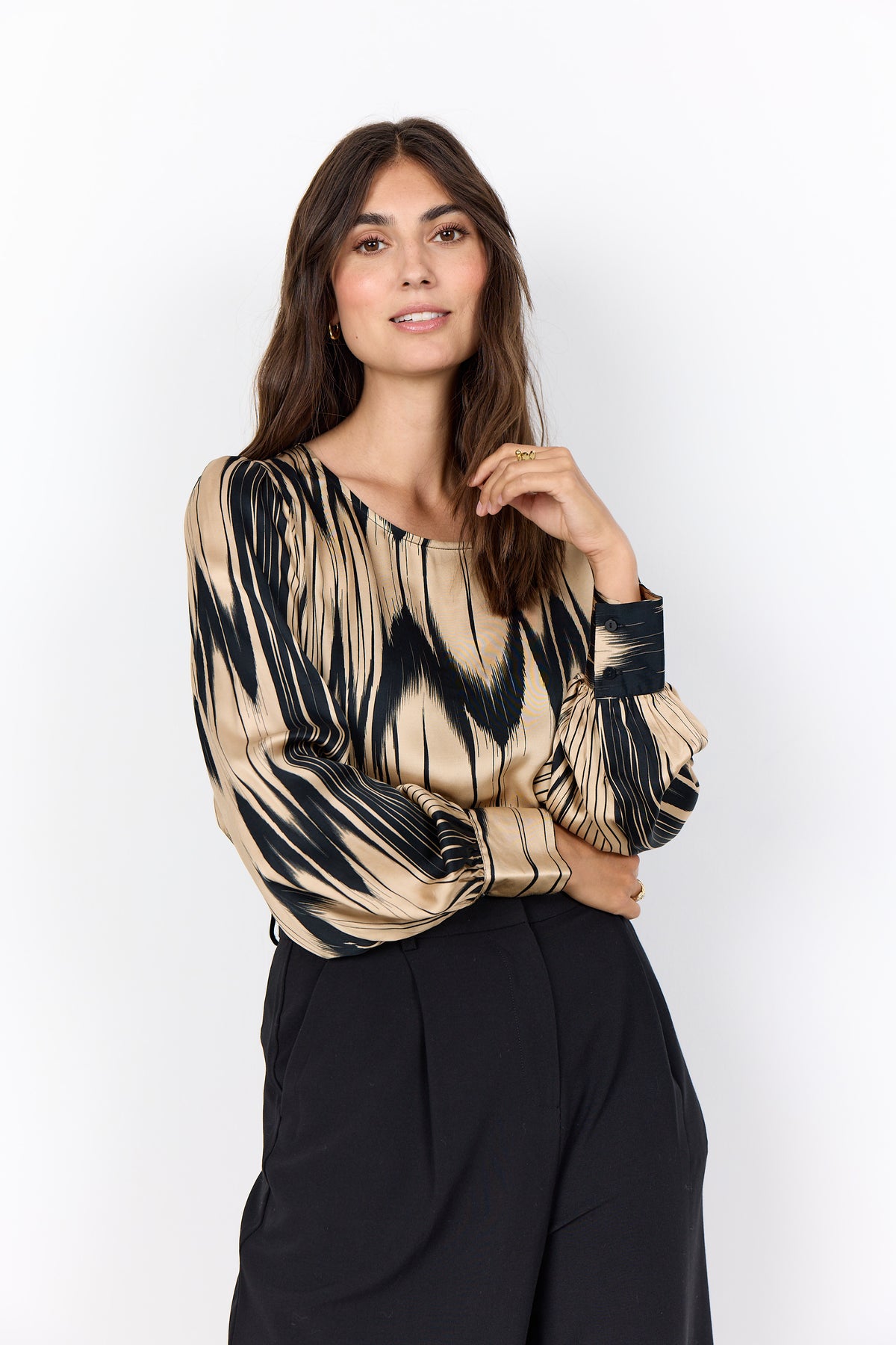 VARISSA 1 Blouse is crafted from 50% LENZING™ ECOVERO™ Viscose, 50% Viscose. It features a round neckline, long sleeves with button cuffs, and a striking abstract print. Pair it with tailored trousers for a refined look or jeans for casual outings.