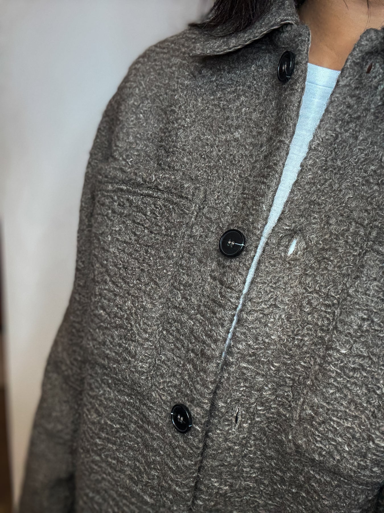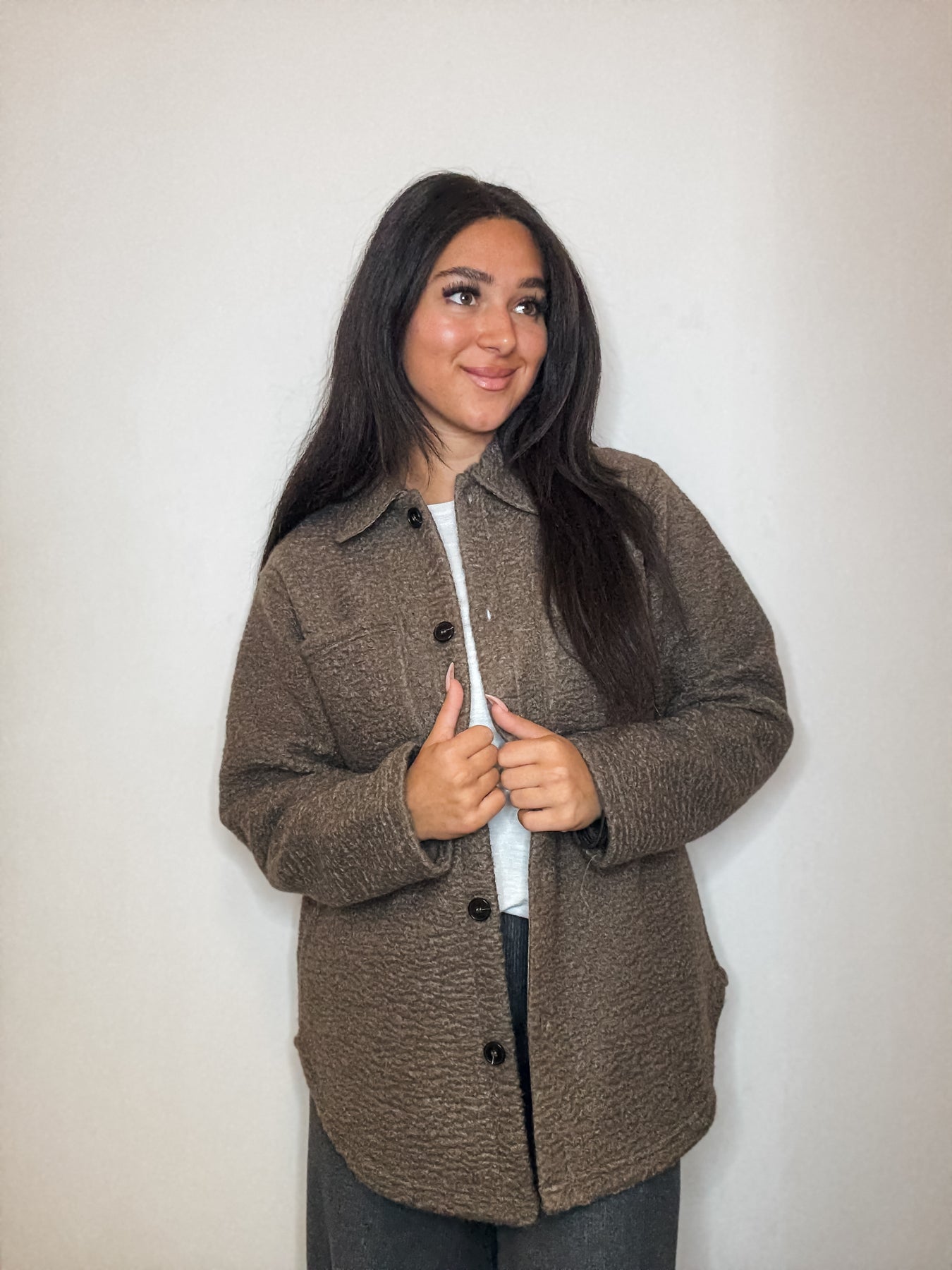Experience comfort and style with the Coline Shacket. Crafted from soft boucle-like material, it feels cozy while its oversized yet flattering fit adds effortless chic to any look. Featuring a calming earth tone, this shacket is the perfect finishing touch to elevate your everyday outfits. Embrace the return of shackets in a versatile piece designed for both comfort and fashion.