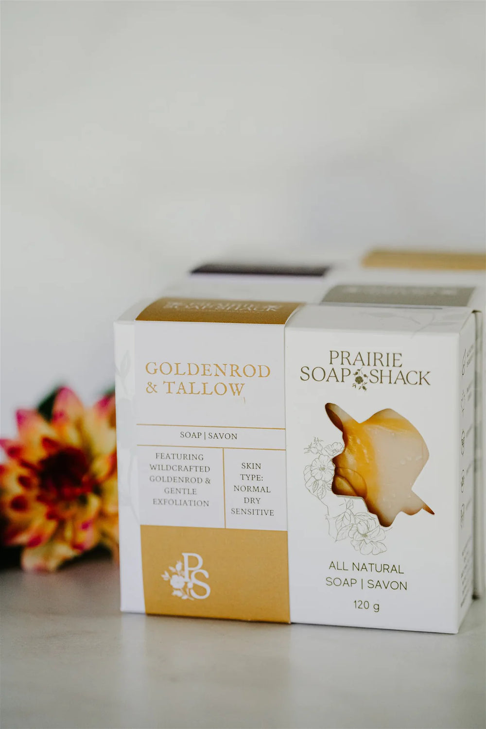 Transport yourself to a fresh breeze in the Alberta wilds with our Goldenrod + Tallow Soap. Infused with wild goldenrod flowers and scented with lemongrass, lemon + lavender essential oils, this bar is a luxurious treat for your skin. Poppyseeds give a gentle exfoliation, while anti-inflammatory properties from the goldenrod work to soothe sensitive skin. No artificial colors or scents, naturally colored with annatto. A perfect indulgence to connect with the prairies and soothe your skin