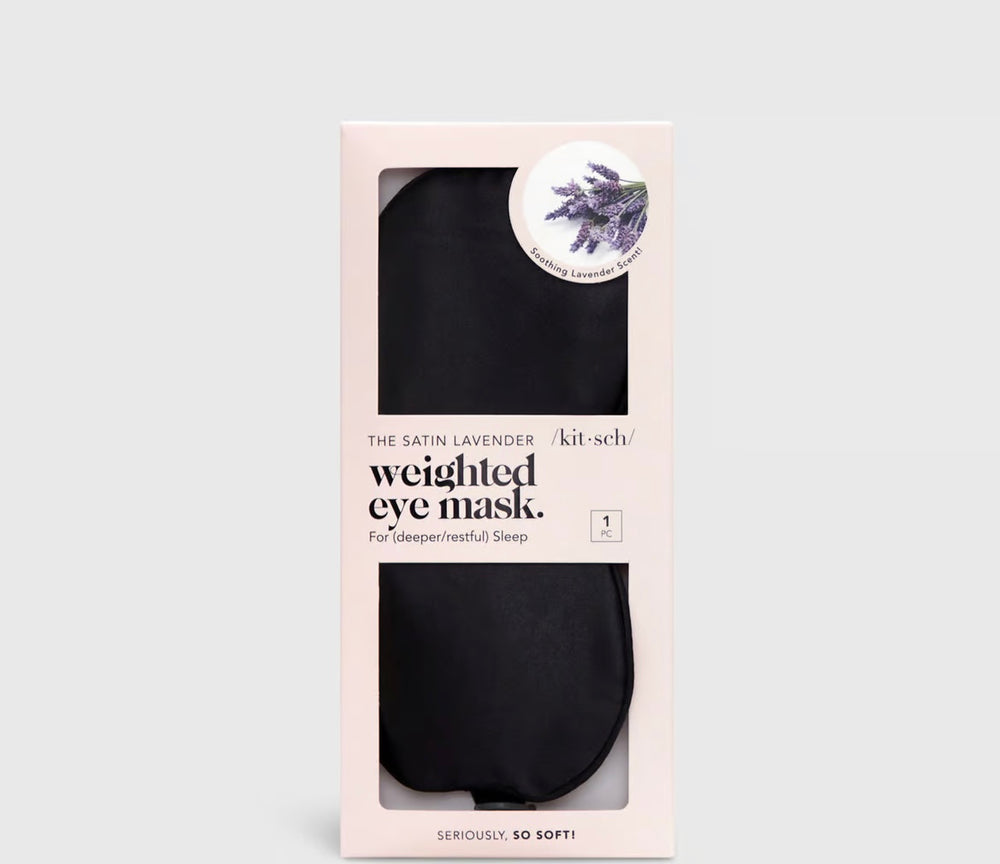 Get ready to relax & rejuvenate with Kitsch Lavender Weighted Satin Eye Mask. Self care at its finest, the luxurious satin fabrication is designed to care for your skin, and help you sleep comfortably, all while looking chic! Weighted function may help ease tension headaches & promote deeper sleep while enjoying the fresh scent of the mask's real dried lavender seed filling. Includes adjustable fit elastic strap.