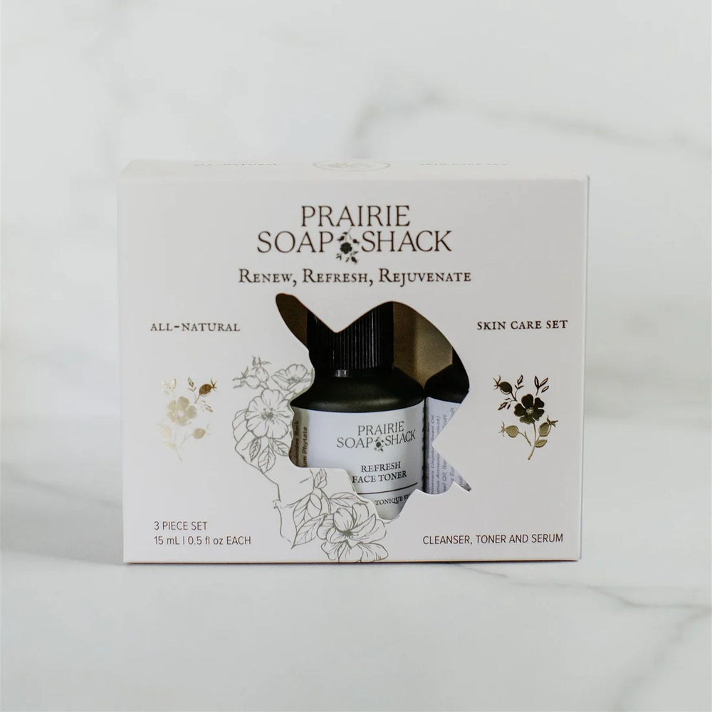 Experience the essence of your skincare ritual in travel-friendly form. Our Mini Skincare Trio features our three bestselling formulas—Renew Oil Cleanser, Refresh Face Toner, and Rejuvenate Face Serum—each in a 15 mL glass bottle size, beautifully packaged in a custom-designed gift box.