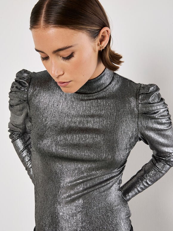 Elevate your wardrobe with this statement metallic foil top. In a figure-hugging fit, it features ruched puff shoulders, a mock neck, and a keyhole fastening at the nape. Style yours with tailored trousers and heeled boots to take it from day to date night.