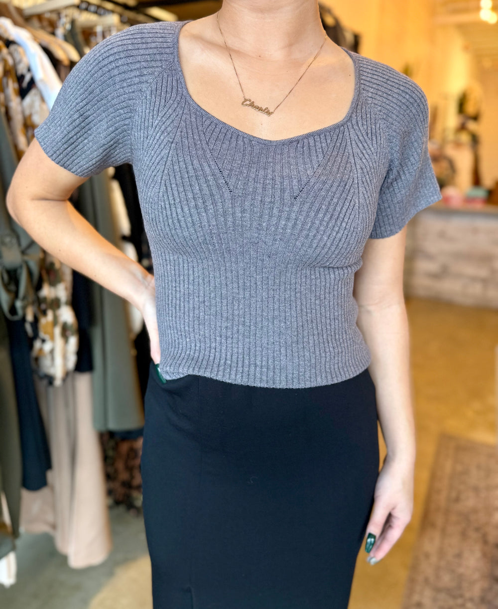 Indulge in ultimate comfort with our Rose Sweater Tee! Made from soft and stretchy material, this tee is as comfy as it is flattering. The rib knit adds a touch of sophistication, while the sweetheart neckline adds a flirty element. Grab it in grey for a versatile addition to your wardrobe.