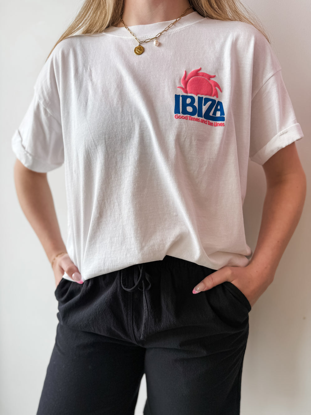 Introducing the Ibiza Boyfriend Tee! Featuring a crisp white base and vibrant pink and blue graphics on the front and back. Made for comfort and style, this tee is sure to flatter and add a fun touch to any every day outfit. Pre rolled sleeves and a great length make it a must-have for any wardrobe.
