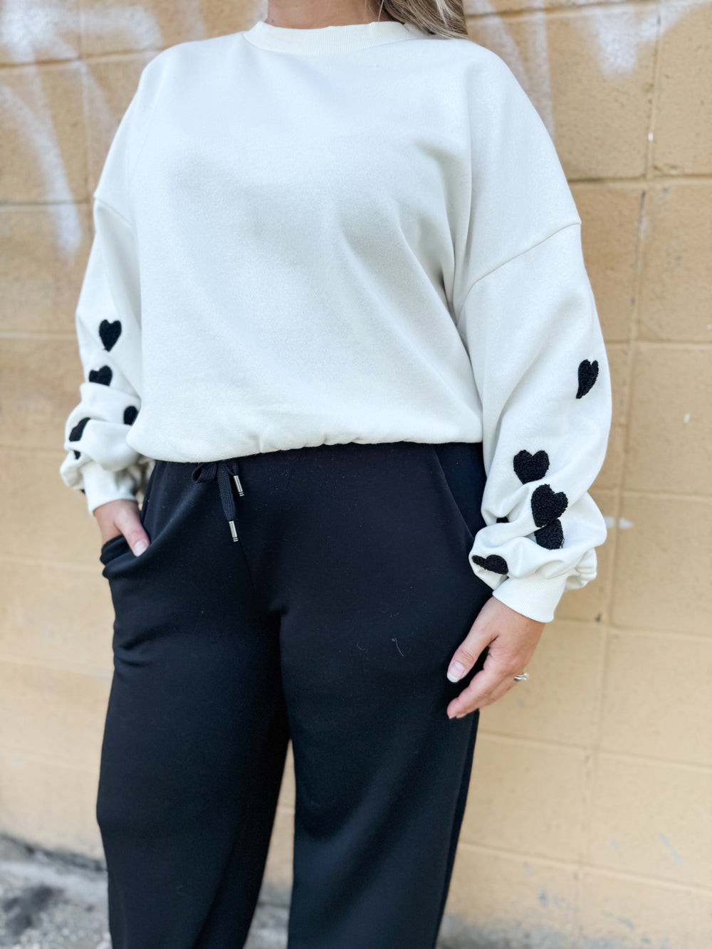 The Macy Sweatshirt - Black Hearts combines cozy comfort with stylish charm. Its oversized fit offers a flattering silhouette and perfect length for everyday wear. Soft fabric and delicate black heart details on the sleeves add a playful, feminine touch to this effortlessly cute must-have.