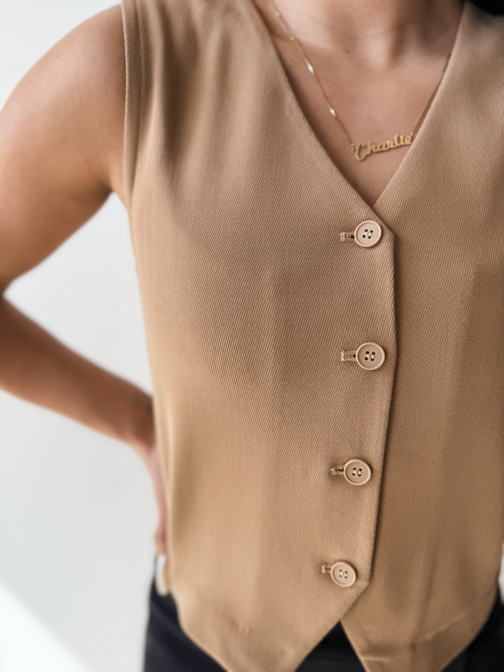 Experience effortless style with the Thana Vest Top in tan! This versatile top offers a flattering fit and is made with lightweight and comfortable materials. Elevate your wardrobe with this must-have piece and dress it up or down for a number of occasions.