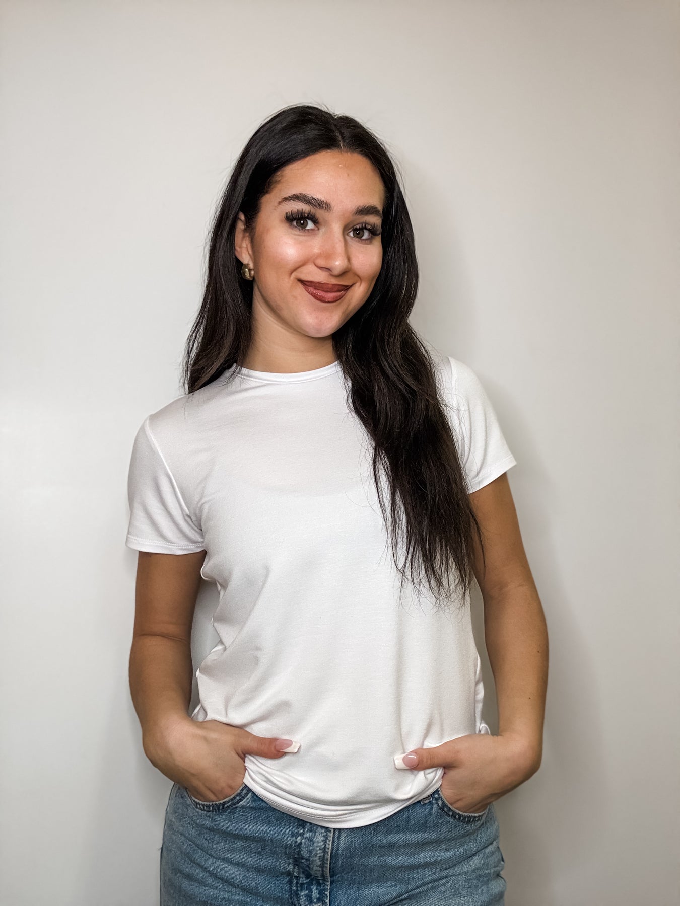 The Marilyn Tee is your new wardrobe MVP—effortlessly chic and impossibly comfortable. This crisp white essential features a light, airy fit that flatters every frame, making it the perfect layering piece or standalone staple. Whether you're dressing it up or keeping it casual, this timeless tee delivers that just-right comfort without any fuss. Simple, versatile, and undeniably wearable.
