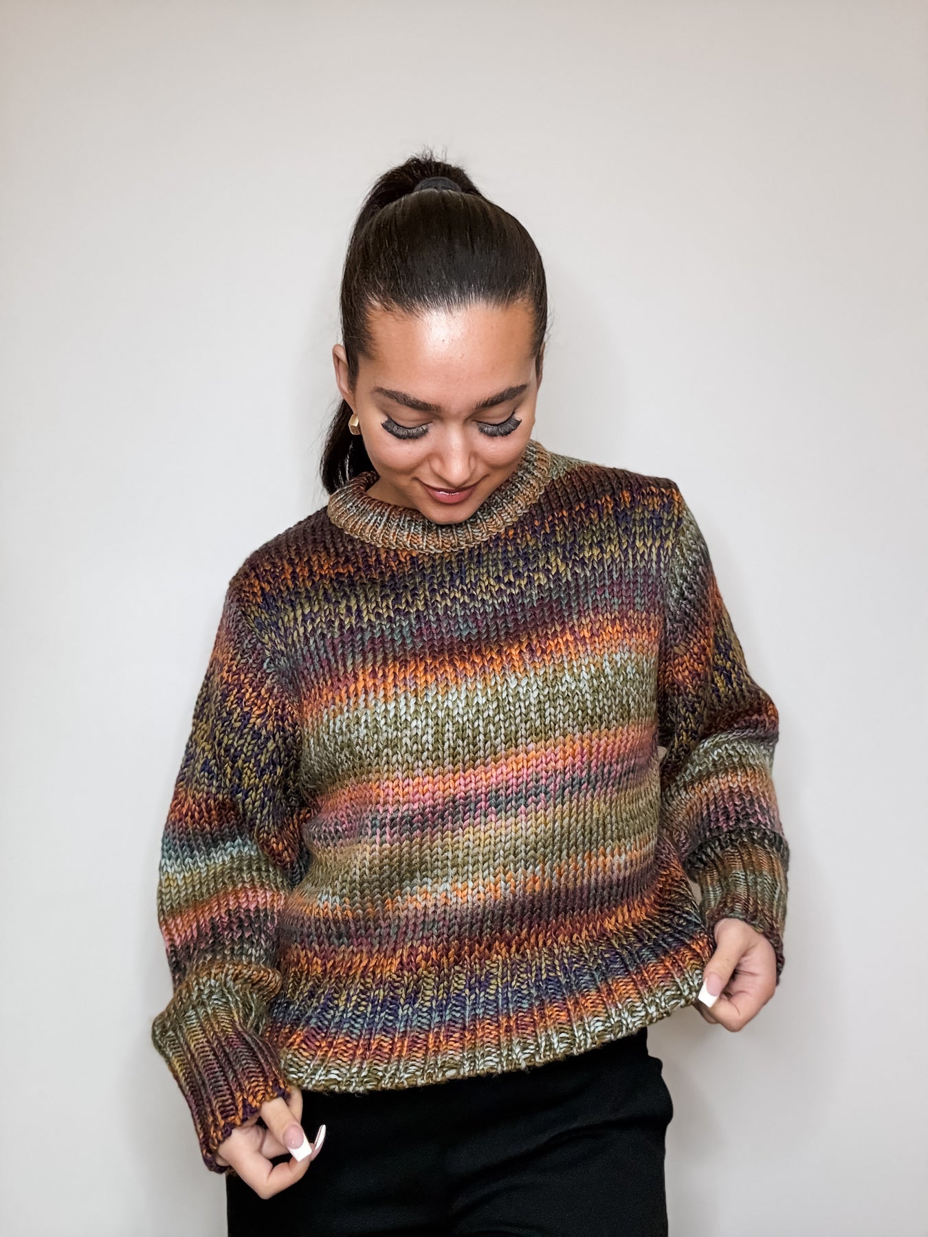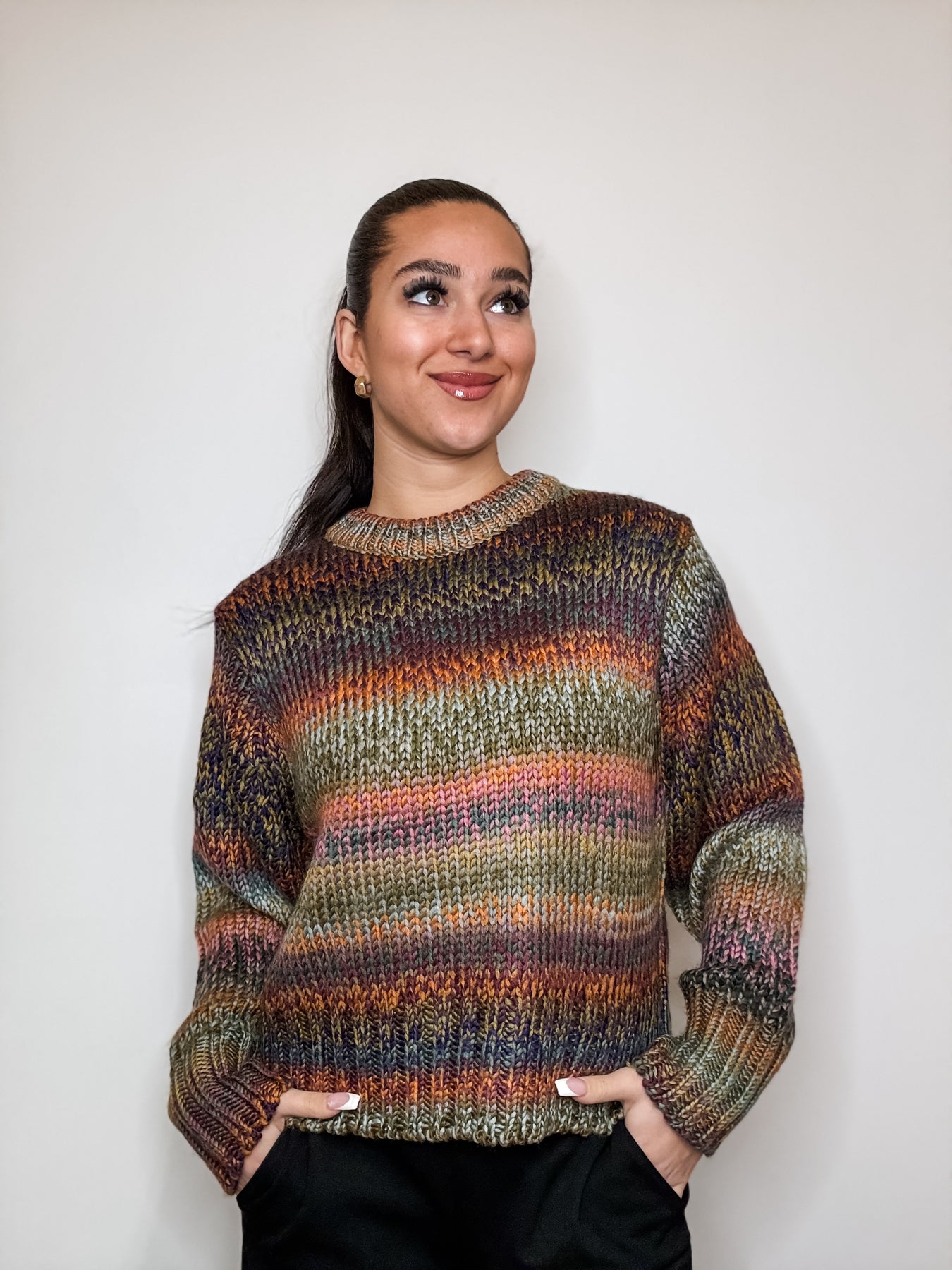 Wrap yourself in cozy comfort with this chunky multi-color sweater that brings joy to your everyday wardrobe. The vibrant blend of hues creates a fun, eye-catching look that flatters effortlessly, while the soft, oversized fit keeps you feeling relaxed and confident. Perfect for layering or wearing solo, this playful piece transforms any outfit into something special.